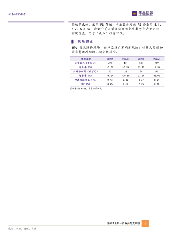 病理科是AI应用拓展最早,效率提升显著领域之一,进入2025年“瑞智病理”大模型发布,病理AI进入加速发展的阶段。公司业务服务于病理诊断的全流程,是病理数字化和智能化重要环节。公司收入结构也从受集采影响的HPV试剂逐步向数字化病理业务升级,我们预测公司2024-2026年收入分别为4.71、5.33、6.07亿元,归母净利润分别为0.26、0.34、0.51亿元,EPS分别为0.28、0.37、0.54元,因为AI病理和新产品都在投入期,公司研发费用占到了收入的较高比例,采用PS估值,当前股价对应PS分别为8.1、7.2、6.3倍,看好公司目前在病理智能化趋势中产业定位,首次覆盖,给予“买入”投资评级。