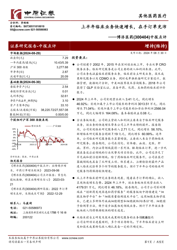 博济医药在2024年上半年表现出色,营业收入和净利润均实现高速增长,核心驱动力在于临床研究服务业务的强劲表现和新增合同额的显著提升。公司在临床前研究、CDMO和中药服务等多元业务板块也取得了积极进展。尽管综合毛利率有所下降,但公司通过有效的费用控制,保持了良好的盈利能力。高达25.16亿元的在手订单为公司未来业绩增长奠定了坚实基础,预计下半年订单转化将加速。综合来看,博济医药展现出强大的市场竞争力和持续增长潜力,因此维持“增持”的投资评级,但投资者仍需关注医疗政策、订单确认及自主研发转化等潜在风险。