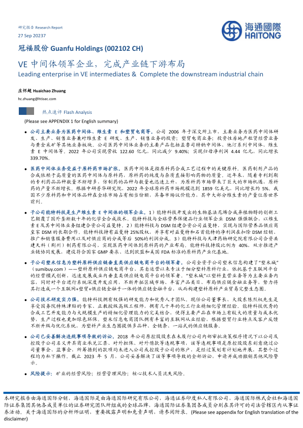 本报告分析了冠福股份在医药中间体、维生素E和塑贸电商领域的主要业务和竞争优势。公司医药中间体业务受益于原料药市场扩张,子公司能特科技在维生素E中间体领域具有领先地位,并通过与DSM的合作和产业链布局实现增长。子公司塑米信息在塑贸电商领域具有优势,致力于构建完整的产业生态圈。同时,报告也提示了公司面临的经营风险和技术人员流失风险。