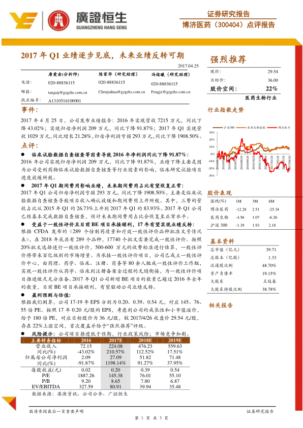 博济医药在2016年及2017年Q1受行业政策影响,业绩出现大幅下滑和亏损,但随着临床试验数据自查核查工作的基本完成,以及公司积极布局仿制药一致性评价和BE项目,其业绩已显现触底反弹的迹象。一致性评价带来的百亿级市场增量为公司提供了重要的发展机遇,公司在BE项目承接方面的顺利进展有望驱动未来业绩实现高速增长。基于对公司未来盈利能力的乐观预期,分析师给予博济医药“强烈推荐”评级,并设定36.00元/股的目标价,预示着22%的上涨空间。投资者需关注项目推进、政策变化及市场竞争等潜在风险。