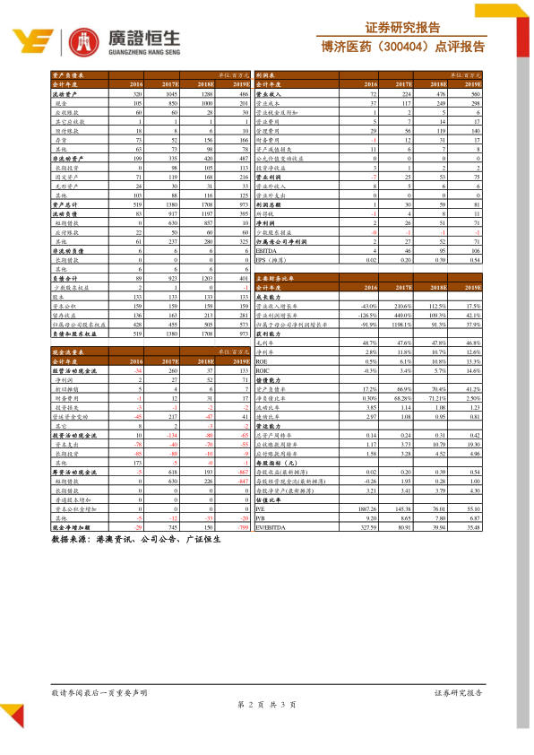 根据分析师测算,博济医药2017年至2019年的每股收益(EPS)预计分别为0.20元、0.39元和0.54元。对应2017年至2019年的市盈率(PE)分别为145倍、76倍和55倍。报告预测,公司营业收入在2017E、2018E、2019E将分别实现210.57%、112.52%、17.51%的同比增长;归属母公司净利润将分别实现1198.14%、91.27%、37.95%的同比增长,显示出强劲的业绩反弹和增长潜力。