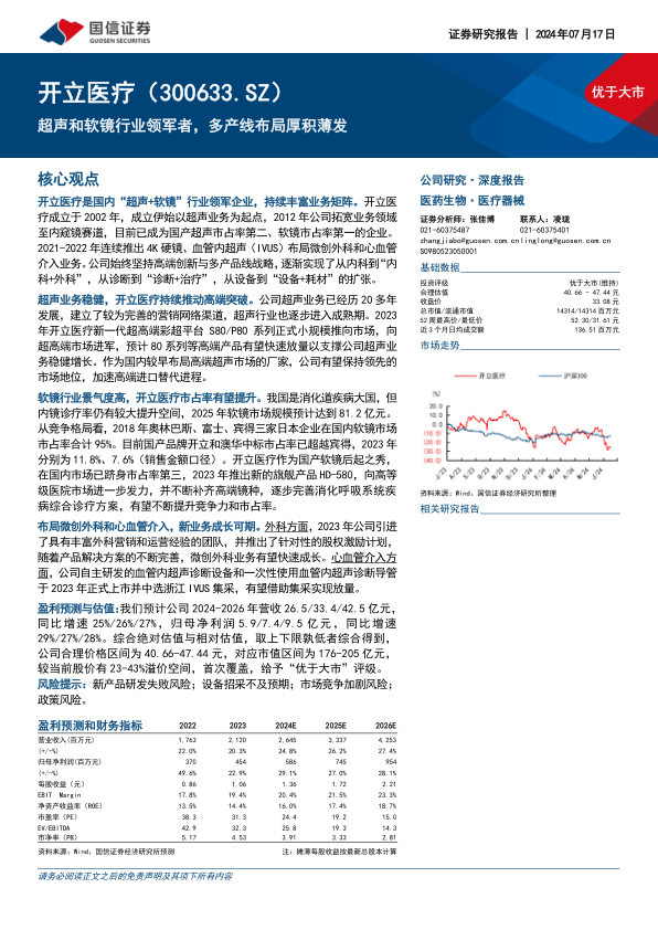 本报告对开立医疗进行了深入分析,认为公司作为国内超声和软镜领域的领军企业,凭借持续的创新和多产品线布局,市场地位稳固。公司超声业务有望保持稳健增长,内镜业务有望快速增长,布局的新业务微创外科和心血管介入有望持续放量。