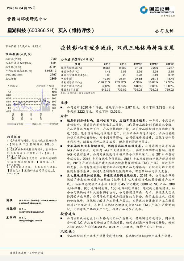 星湖科技短期业绩受2020年第一季度疫情影响略有下滑,但随着国内餐饮行业逐步复工复产,公司盈利能力有望恢复。长期来看,公司通过强化食品添加剂和医药双线业务发展,并积极推进三大产业基地建设,具备持续增长的潜力。