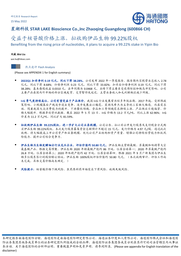 本报告对星湖科技2022年一季度业绩进行了分析,并重点关注了公司拟收购伊品生物的战略举措。