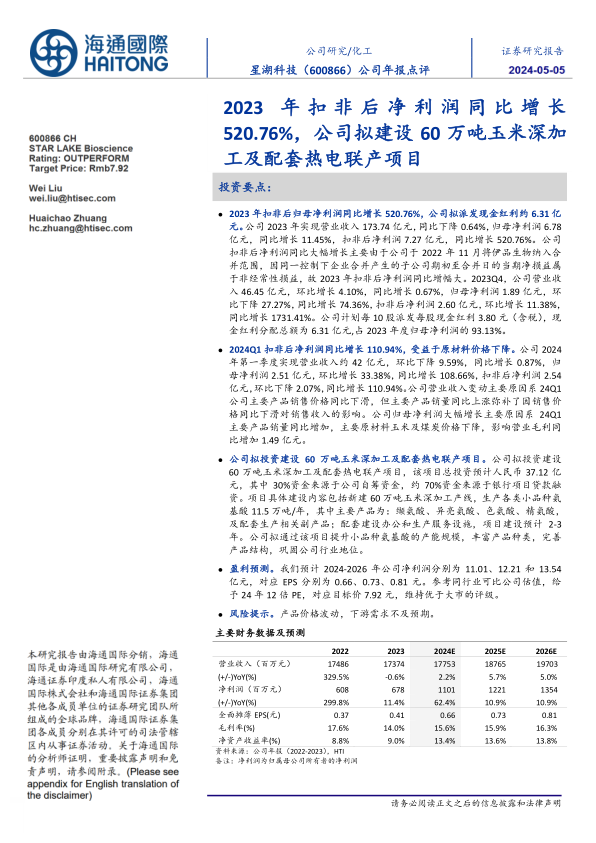 公司年报点评:2023年扣非后净利润同比增长520.76%,公司拟建设60万吨玉米深加工及配套热电联产项目
