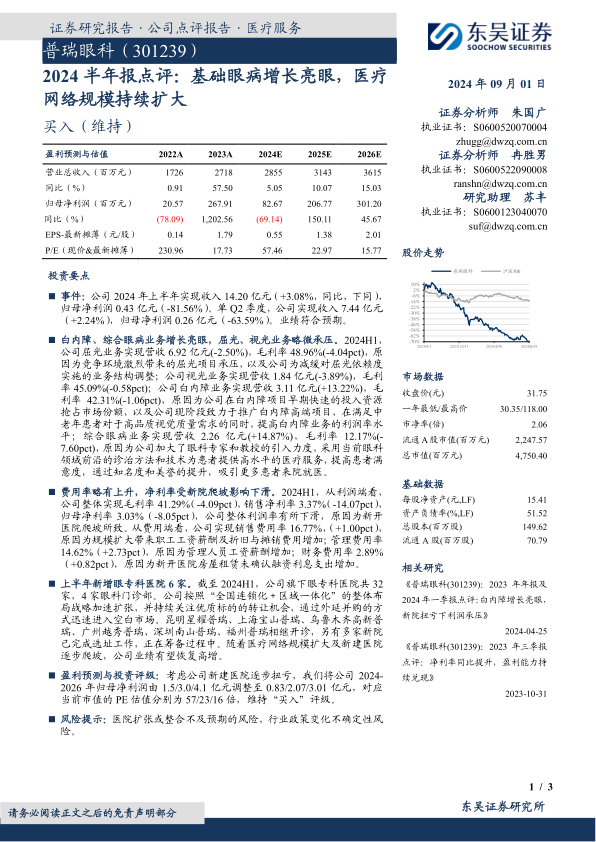 本报告分析了普瑞眼科2024年半年度的业绩表现,指出公司短期内受新院爬坡和业务结构调整的影响,业绩有所承压。但长期来看,随着医疗网络规模的扩大和新建医院逐步扭亏,公司业绩有望恢复高增长。