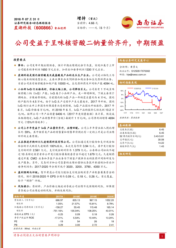 本报告分析了星湖科技受益于I+G量价齐升的现状,以及并购久凌制药带来的潜在增长点。报告预测了公司未来几年的盈利情况,并提示了相关风险。总体而言,星湖科技作为核苷酸类和氨基酸类产品的龙头企业,在I+G行业景气度回升的背景下,具有较好的发展前景。