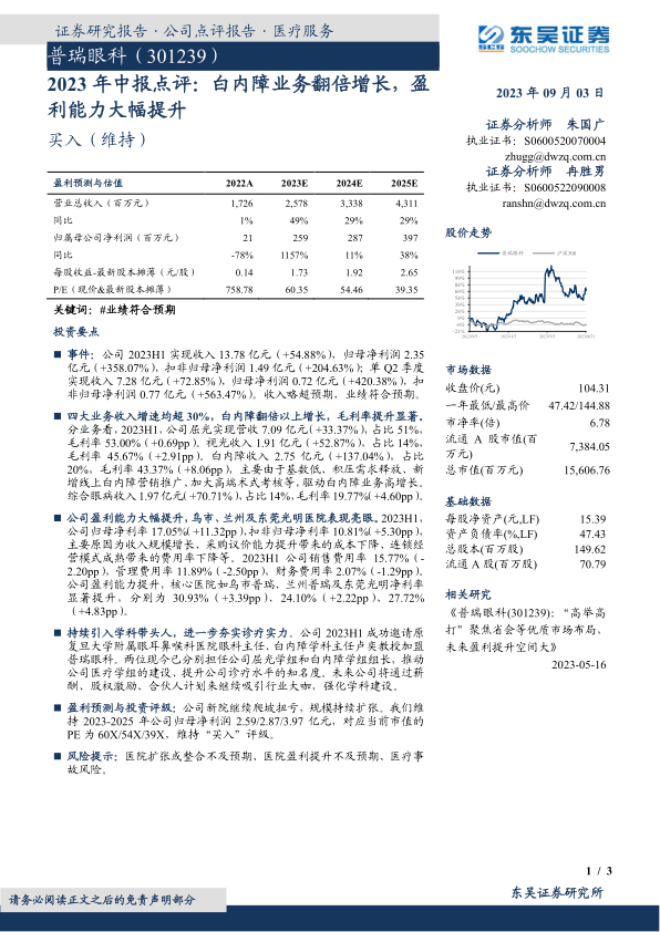 普瑞眼科2023年上半年业绩表现强劲,营收和净利润均实现高速增长,特别是白内障业务实现翻倍增长,成为业绩亮点。公司整体盈利能力大幅提升,毛利率和净利率均有显著改善,这得益于规模效应、成本控制和费用优化。通过持续引入高端医疗人才,公司进一步夯实了诊疗实力。分析师维持“买入”评级,看好公司未来在眼科医疗服务市场的持续扩张和盈利增长潜力,但同时提示了相关运营风险。