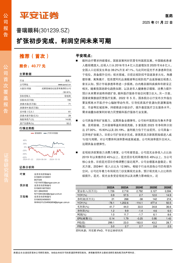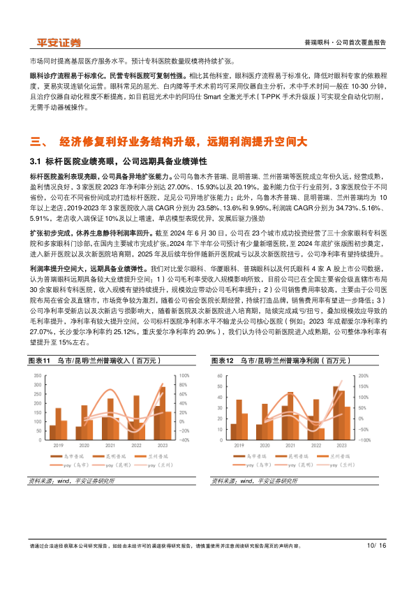 普瑞眼科作为国内领先的民营眼科医疗服务机构,通过在省会城市进行战略性扩张,已初步完成全国布局。公司核心业务屈光项目稳定,视光业务具有增长潜力,同时受益于国家政策对民营医疗的支持以及眼科医疗需求的持续增长。尽管短期内受到市场竞争和消费疲软的影响,公司业绩承压,但随着新医院进入盈利周期和宏观经济的逐步复苏,普瑞眼科有望实现盈利能力的显著提升。此外,公司积极布局老年眼病诊疗领域,将进一步巩固其长期发展的基础。综合考虑公司的发展战略、市场前景和潜在风险,平安证券首次覆盖给予“推荐”评级。