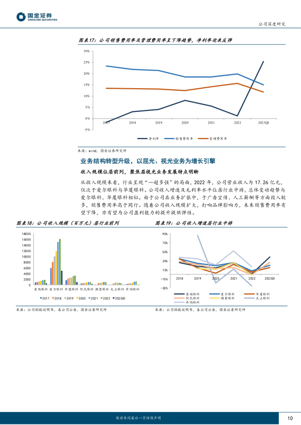 业务结构转型升级,以屈光、视光业务为增长引擎:①2018年以来公司大力发展屈光、视光等非医保结算项目,医保收入占比持续下降,2022年为13.19%,屈光+视光收入占比为71.3%,领先同行。②持续引入先进设备,降低屈光项目成本,为更多患者提供中高端术式,规模效应下提升盈利能力。③将视光视为重点发展方向,人才和技术加持下,收入占比有望提升,利于改善公司盈利水平。④对医保覆盖的白内障项目转型升级,推广高端术式和晶体,2021年,公司高端白内障项目收入占白内障项目总收入的比例提升至34.1%,普通白内障项目收入占比则降至2.7%,医保控费影响减小,未来有望实现稳健增长。