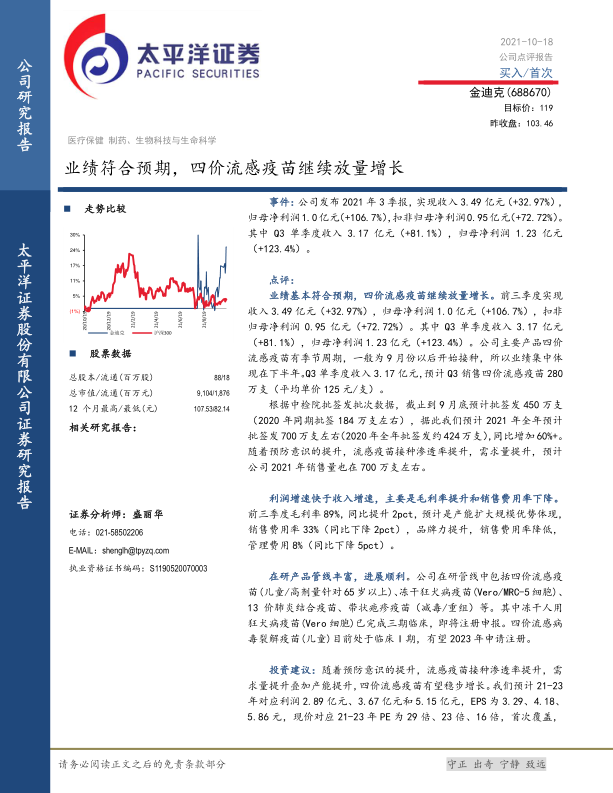业绩基本符合预期,四价流感疫苗继续放量增长。前三季度实现收入3.49亿元(+32.97%),归母净利润1.0亿元(+106.7%),扣非归母净利润0.95亿元(+72.72%)。其中Q3单季度收入3.17亿元(+81.1%),归母净利润1.23亿元(+123.4%)。公司主要产品四价流感疫苗有季节周期,一般为9月份以后开始接种,所以业绩集中体现在下半年。Q3单季度收入3.17亿元,预计Q3销售四价流感疫苗280万支(平均单价125元/支)。