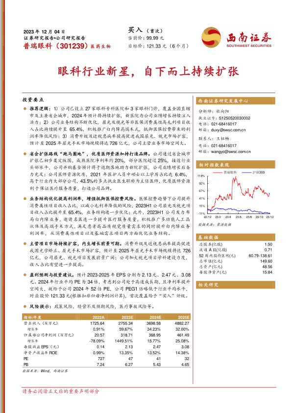 与爱尔眼科、华厦眼科、何氏眼科等可比公司相比,2024年行业平均市盈率(PE)为34倍。考虑到普瑞眼科:1)新开业医院仍处于盈亏平衡期,拖累公司整体净利率(2023Q3扣非净利率10.6%,低于爱尔眼科19.4%和华厦眼科18.5%),但未来有较大提升空间;2)公司成熟医院盈利能力突出,新建医院逐步成熟后将贡献收入及利润增量,发展前景向好。因此,给予公司2024年52倍PE,公司PEG(市盈率相对盈利增长比率)1倍略低于行业平均水平(行业平均PEG1.15倍,采用扣非归母净利润增速计算)。对应目标股价121.33元(根据扣非归母净利润计算),首次覆盖给予“买入”评级。