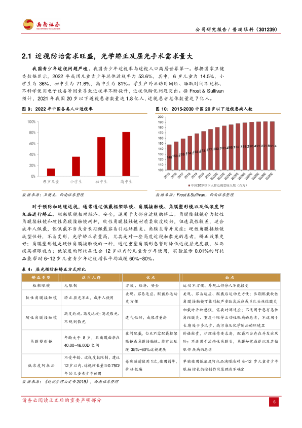 青少年近视问题尤为严峻。国家卫健委数据显示,2022年我国儿童青少年总体近视率为53.6%,其中6岁儿童为14.5%,小学生36%,初中生71.6%,高中生81%。Frost & Sullivan预计,2021年我国20岁以下近视患者达1.8亿人,总近视患者达7亿人。近视防治手段包括框架眼镜、角膜接触镜、角膜塑形镜(能有效延缓35%~60%近视进展)和低浓度阿托品。