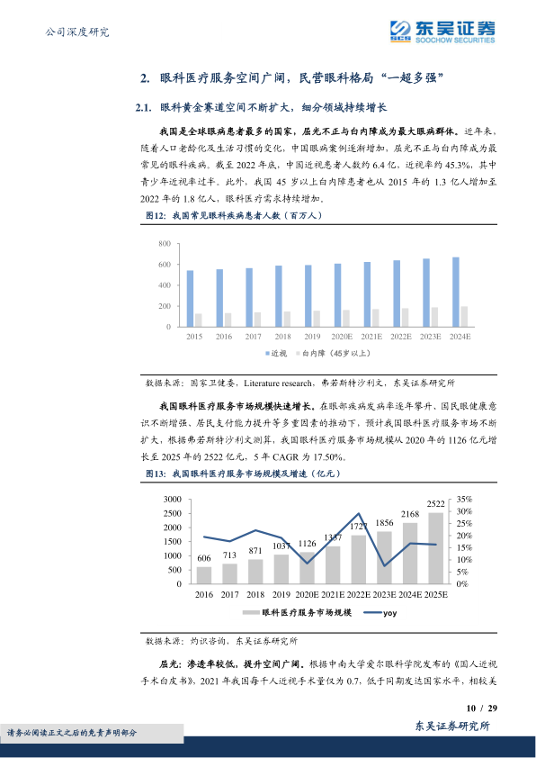 我国眼科医疗需求持续增长,手术渗透率有望提升。我国是眼科患者最多的国家,至2022年估计近视人群已超6亿,45岁以上白内障患者人群约1.8亿。由于人口老龄化及用眼习惯变化等因素,各类眼科需求将持续增长。根据灼识咨询预测,2025年我国眼科医疗服务市场规模约2522亿元,2020-2025年CAGR为17.50%。其中,预计至2025年屈光、视光市场规模分别约725亿元、500亿元,2020-2025年CAGR分别为28.37%、14.60%。