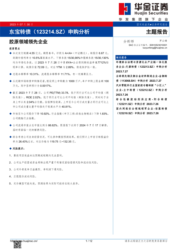 综合可比券表现和多元回归模型预测,报告预计东宝转债上市首日转股溢价率约为26.43%,对应价格区间为119.75元至132.35元。投资者在申购时应充分权衡公司基本面优势、转债条款特性以及潜在的市场和经营风险。