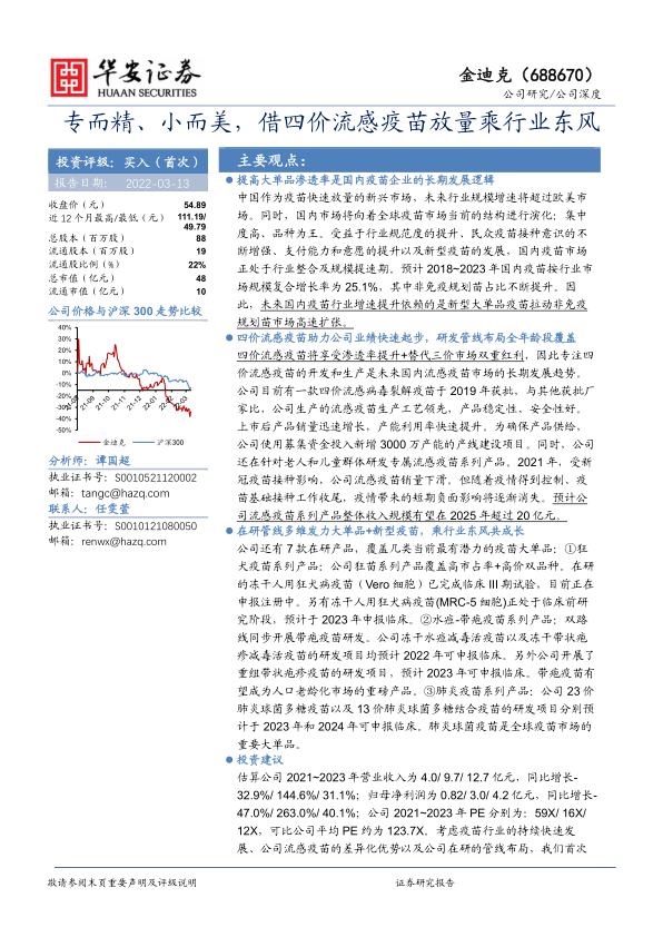 根据预测,金迪克2021-2023年营业收入分别为4.0亿元、9.7亿元和12.7亿元,同比增长-32.9%、144.6%和31.1%。归母净利润分别为0.82亿元、3.0亿元和4.2亿元,同比增长-47.0%、263.0%和40.1%。公司2021-2023年PE分别为59X、16X和12X,远低于可比公司平均PE(约123.7X)。流感疫苗产品线(包括已上市四价流感疫苗和儿童用四价流感疫苗)预计在2021-2025年合计销售额将从3.96亿元增长至22.68亿元。此外,预计狂犬疫苗(Vero细胞)将于2022-2023年获批生产,2023-2025年销售额预计分别为56百万元、68百万元和79百万元。
