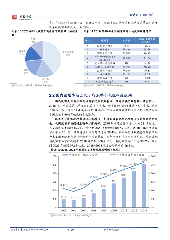 肺炎是导致5岁以下儿童死亡的主要疾病之一,全球每年约有1亿例新发病例。肺炎球菌疫苗在全球疫苗销售额中稳居榜首,辉瑞的Prevnar13在2020年以59.5亿美元的销售额位列全球药品销售榜第12名。全球肺炎球菌疫苗市场预计将从2021年的84亿美元增长到2026年的118亿美元,复合年增长率为7%。我国肺炎球菌疫苗接种率较低,例如65岁以上人群中23价肺炎球菌多糖疫苗渗透率不足1%,与发达国家存在巨大差距,市场前景广阔。国内市场主要有23价肺炎球菌多糖疫苗(PPSV23)和13价肺炎球菌结合疫苗(PCV13)两种类型。近年来,多款国产肺炎疫苗获批上市,国产替代进程加速。金迪克在研的23价肺炎球菌多糖疫苗(拟适用于50岁以上人群)和13价肺炎球菌多糖结合疫苗(拟适用于2-15月龄儿童)均处于临床前研究阶段,分别预计于2023年和2024年申报临床。