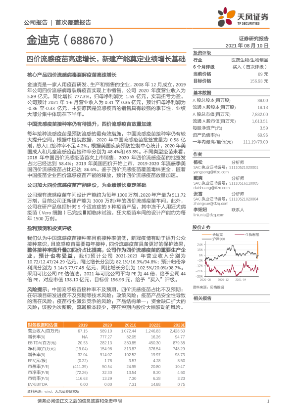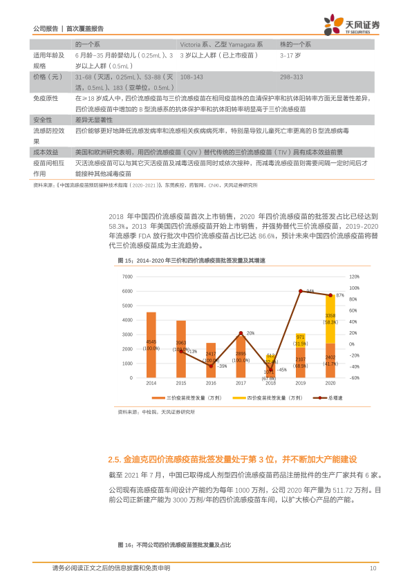 风险提示:中国流感疫苗接种率不及预期,四价流感疫苗占比不及预期;在研项目研发进度不及预期等技术风险;政策风险;疫苗产品安全性导致的潜在风险;疫苗行业激烈竞争的风险;产品结构单一;资金缺口扩大的风险;该股为次新股,流通股本较少,存在短期内股价大幅波动的风险。
