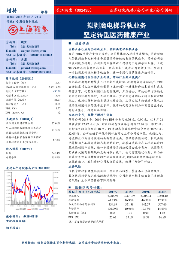 长江润发正积极转型医药健康产业,剥离传统电梯导轨业务,聚焦医药主业。医药业务已成为公司新的增长引擎,且公司有望通过外延式发展和并购基金等方式保持快速发展。化药注射剂行业面临产业升级,行业集中度有望提升,优质企业将受益于政策红利和市场份额的提高。长江润发旗下的海灵药业作为头孢菌素龙头,有望巩固其市场地位并拓展新的利润增长点。维持“增持”评级。