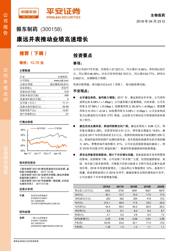 振东制药2017年业绩增长主要受益于康远制药的并表以及朗迪钙的良好市场表现。公司通过合并康远制药,显著提升了盈利能力,净利率和毛利率均有所提高。