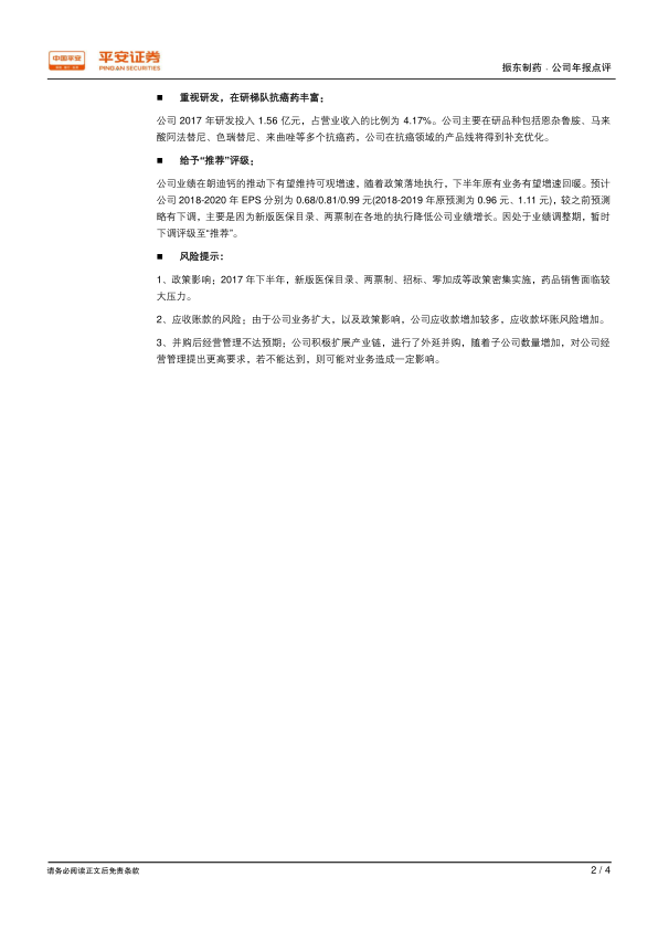 给予“推荐”评级。预计公司2018-2020年EPS分别为0.68/0.81/0.99元,较之前预测略有下调,主要是因为新版医保目录、两票制在各地的执行降低公司业绩增长。