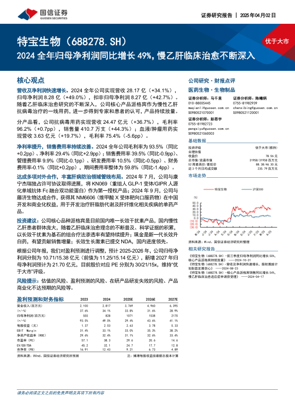 公司在2024年持续优化盈利能力,净利率同比提升2.9个百分点至29.4%,同时期间费用率整体下降1.4个百分点至59.8%,显示出良好的成本控制和运营效率。此外,特宝生物通过与康宁杰瑞、藤济生物等达成多项对外合作,积极丰富了在肝病防治领域的管线布局,为未来的持续增长奠定了基础。分析师维持“优于大市”评级,并预计公司未来三年归母净利润将保持高速增长。