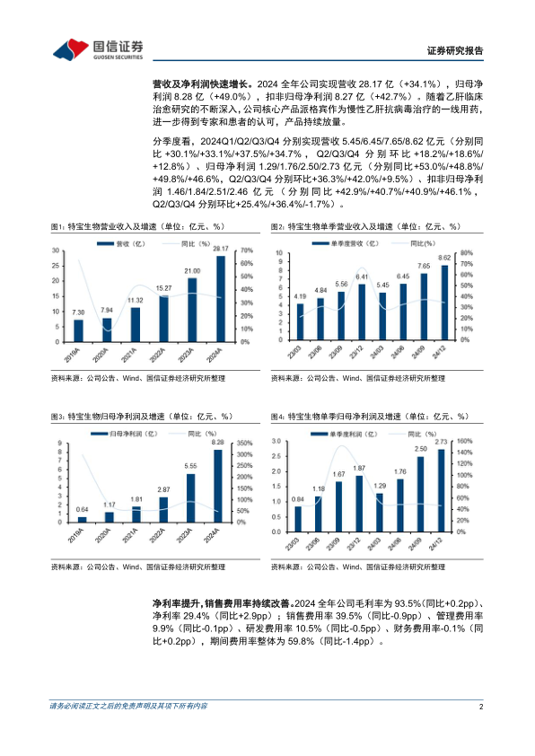 营收及净利润快速增长。2024全年公司实现营收28.17亿(+34.1%),归母净利润8.28亿(+49.0%),扣非归母净利润8.27亿(+42.7%)。随着乙肝临床治愈研究的不断深入,公司核心产品派格宾作为慢性乙肝抗病毒治疗的一线用药,进一步得到专家和患者的认可,产品持续放量。