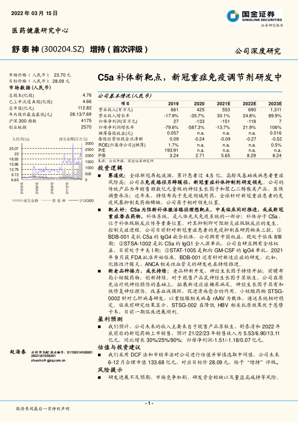 赛道优:全球新冠再起波澜,累计患者过4.5亿,高龄及基础疾病患者重症风险高;公司在免疫路径另辟蹊径,新冠重症补体抑制剂研发领先。公司的传统产品为年销售额数亿元量级的神经生长因子和聚乙二醇散类产品,医保调整承压;近年来,持续布局于免疫领域用药,全球针对新冠重症患者的免疫风暴抑制类药物稀缺,公司居于相对领先位置。