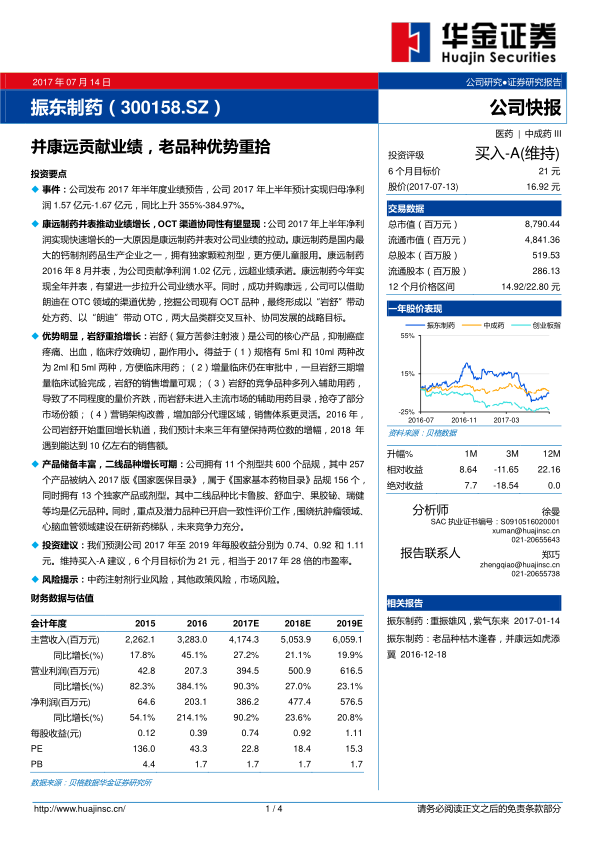华金证券维持振东制药“买入-A”评级,并预测公司2017年至2019年每股收益分别为0.74元、0.92元和1.11元。给予6个月目标价21元,相当于2017年28倍的市盈率。