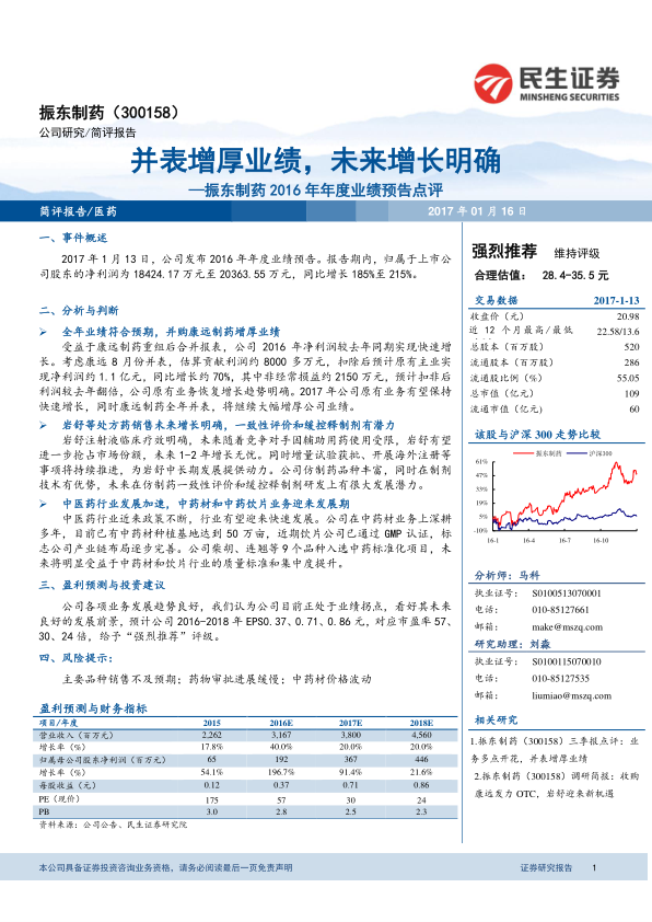 本报告对振东制药2016年年度业绩预告进行了分析,认为公司全年业绩符合预期,并购康远制药显著增厚业绩,原有业务恢复增长。岩舒等处方药销售未来增长明确,一致性评价和缓控释制剂有潜力。中医药行业迎来发展期,公司中药材和中药饮片业务受益。维持“强烈推荐”评级,但需注意主要品种销售、药物审批和中药材价格波动等风险。