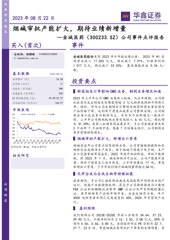 本报告对金城医药2023年半年报业绩进行了分析,指出新冠相关订单减少和生物原料药价格下滑导致公司业绩下滑,但制剂业务保持高增长。重点分析了烟碱业务,认为其受益于审批扩产和出口资质提升,将成为公司新的业绩增长点。同时,公司在培南类医药中间体和合成生物学方面也在积极拓展。报告预测了公司未来三年的收入和利润,并首次覆盖给予“买入”评级,但也提示了原料药价格波动、医药反腐和电子烟监管等风险。