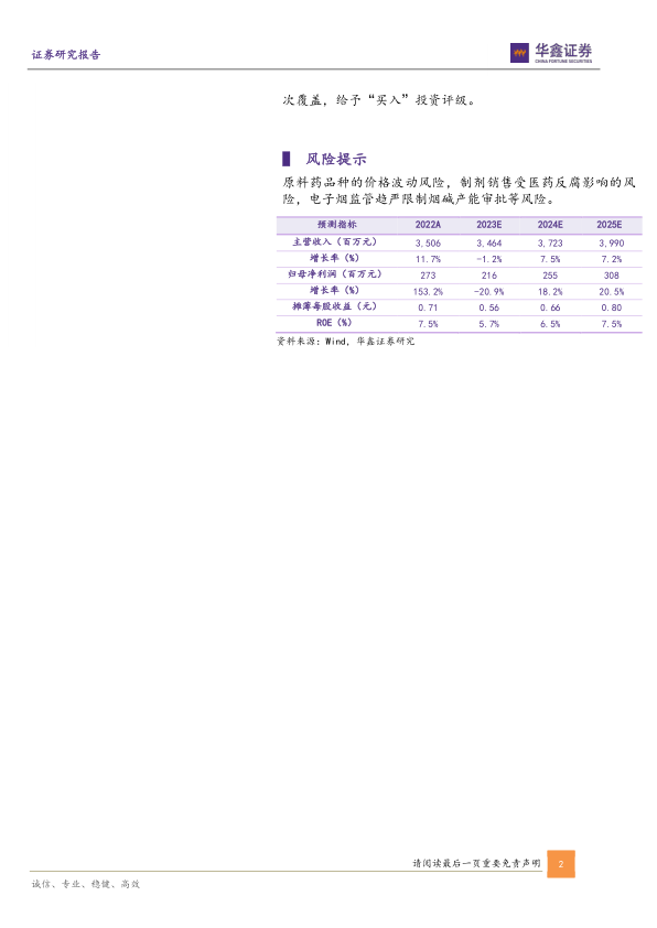 我们预测公司2023E-2025E年收入分别为34.64、37.23、39.90亿元,归母净利润为2.16、2.55、3.08亿元,EPS分别为0.56、0.66、0.80元,当前股价对应PE分别为32.7、27.7、23.0倍,考虑烟碱业务审批扩产带来的业绩增量,首次覆盖,给予“买入”投资评级。