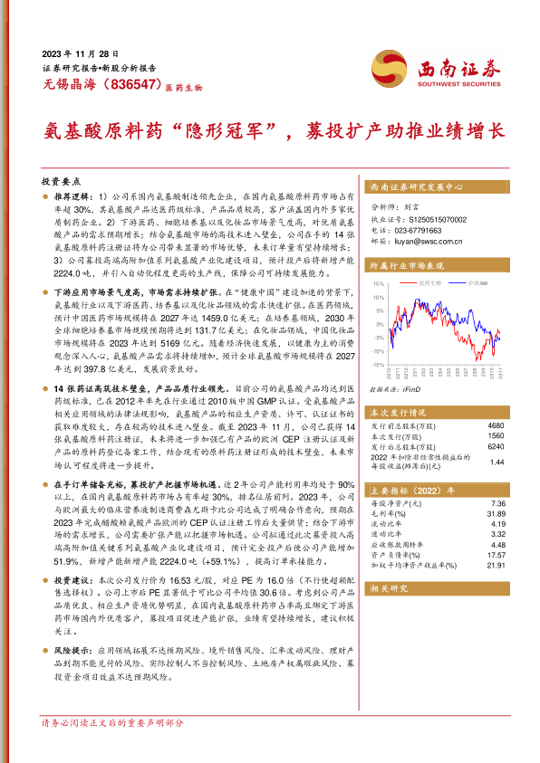 投资建议:本次公司发行价为16.53元/股,对应PE为16.0倍(不行使超额配售选择权)。公司上市后PE显著低于可比公司平均值30.6倍。考虑到公司产品品质优良、相应生产资质优势明显,在国内氨基酸原料药市占率高且绑定下游医药市场国内外优质客户,募投项目促进产能扩张,业绩有望持续增长,建议积极关注。