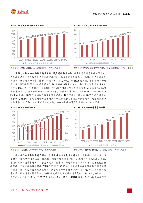 下游应用市场景气度高,市场需求持续扩张。在“健康中国”建设加速的背景下,氨基酸行业以及下游医药、培养基以及化妆品领域的需求快速扩张。在医药领域,预计中国医药市场规模将在2027年达1459.0亿美元;在培养基领域,2030年全球细胞培养基市场规模预期将达到131.7亿美元;在化妆品领域,中国化妆品市场规模将在2023年达到5169亿元。随着经济快速发展,以健康为主的消费观念深入人心,氨基酸产品需求将持续增加,预计全球氨基酸市场规模将在2027年达到397.8亿美元,发展前景良好。