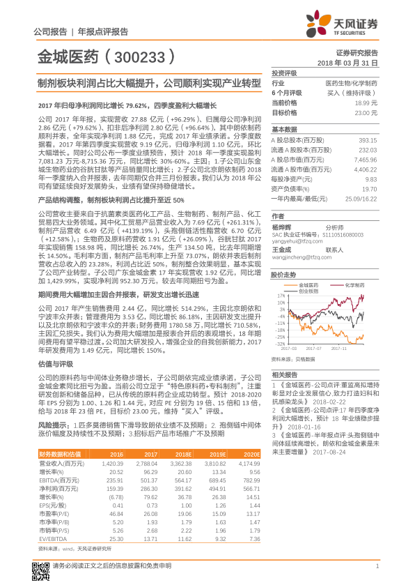 金城医药2017年业绩表现亮眼,成功实现产业转型,制剂板块利润占比大幅提升。公司在原料药和中间体业务稳步增长的同时,注重研发创新和储备品种。天风证券看好公司未来发展,维持“买入”评级,但同时也提示了相关风险,包括朗依业绩不及预期、中间体涨价不及预期以及市场推广风险。