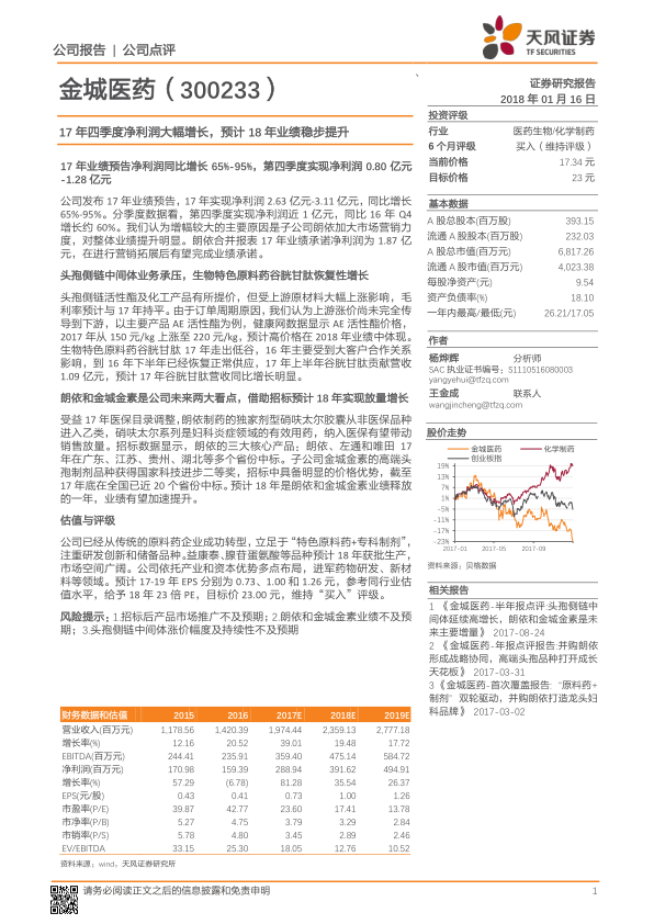 金城医药2017年四季度净利润大幅增长,主要受益于子公司朗依的市场拓展和谷胱甘肽业务的复苏。公司未来增长点在于朗依制药和金城金素,受益于医保目录调整和招标优势,预计2018年业绩有望加速提升。维持“买入”评级,目标价23.00元。需关注市场推广、业绩不及预期以及原材料涨价等风险。