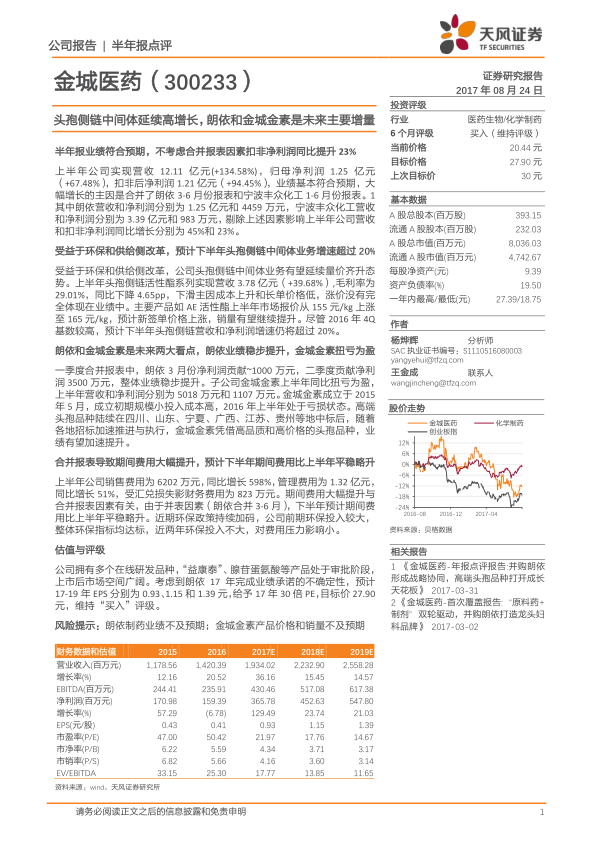 金城医药2017年半年报业绩符合预期,受益于合并报表和头孢侧链中间体业务的增长,公司营收和利润均实现大幅提升。朗依和金城金素作为未来增长点,有望为公司带来新的增长动力。维持“买入”评级,但需关注朗依业绩和金城金素产品价格和销量不及预期的风险。