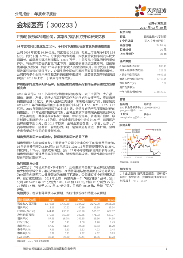 展望2017年,在不考虑朗依合并报表等因素的情况下,预计销售费用率和管理费用率将保持平稳,财务费用率较低且波动对整体利润影响不大。基于公司“特色原料药+专科制剂”的战略转型和新业务的并入,报告预测金城医药2017-2019年每股收益(EPS)分别为1.00元、1.20元和1.49元,对应市盈率(PE)分别为25倍、21倍和17倍。报告给予公司2017年30倍估值,目标价30.00元,维持“买入”评级。财务数据显示,公司毛利率、净利率、ROE和ROIC等盈利能力指标预计在未来几年将显著提升,展现出良好的成长前景。