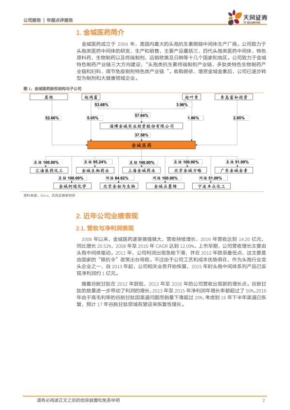 公司主营业务分为医药化工、生物制药和终端制剂三大板块。其中,医药化工板块以头孢类医药中间体为主,2016年头孢侧链活性酯系列产品实现收入5.95亿元,同比增长6.89%,占营业收入的41.92%。尽管“限抗令”对行业产生影响,但头孢菌素作为市场份额最大的抗生素产品,其中间体需求依然强劲,且行业集中度提高对金城医药这类大型上游企业构成利好。生物制药板块的核心产品谷胱甘肽自2012年上市以来,已成为公司拳头品种,2014年销量达到130吨,其高质量和比国内主要竞争对手(日本协和)便宜约10%的价格优势,使其具有较大发展潜力。随着2016年下半年销售渠道的恢复,预计2017年谷胱甘肽收入有望企稳回升,带动利润恢复性增长。