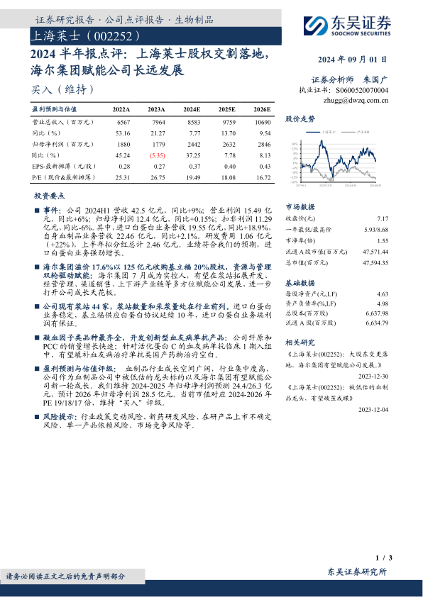 盈利预测与估值评级:血制品行业成长空间广阔,行业集中度高,公司作为血制品公司中被低估的龙头标的以及海尔集团有望赋能公司新一轮成长。我们维持2024-2025年归母净利润预测24.4/26.3亿元,预计2026年归母净利润28.5亿元。当前市值对应2024-2026年PE19/18/17倍,维持“买入”评级。