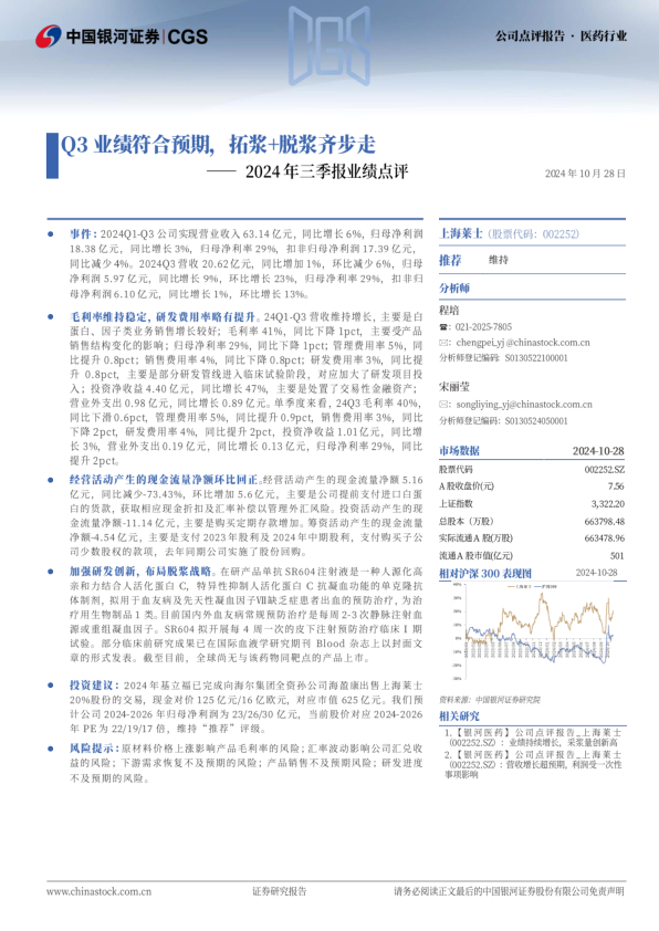 毛利率维持稳定,研发费用率略有提升。24Q1-Q3营收维持增长,主要是白蛋白、因子类业务销售增长较好;毛利率41%,同比下降1pct,主要受产品销售结构变化的影响;归母净利率29%,同比下降1pct;管理费用率5%,同比提升0.8pct;销售费用率4%,同比下降0.8pct;研发费用率3%,同比提升0.8pct,主要是部分研发管线进入临床试验阶段,对应加大了研发项目投入;投资净收益4.40亿元,同比增长47%,主要是处置了交易性金融资产;营业外支出0.98亿元,同比增长0.89亿元。单季度来看,24Q3毛利率40%,同比下滑0.6pct,管理费用率5%,同比提升0.9pct,销售费用率3%,同比下降2pct,研发费用率4%,同比提升2pct,投资净收益1.01亿元,同比增长3%,营业外支出0.19亿元,同比增长0.13亿元,归母净利率29%,同比提升2pct。
