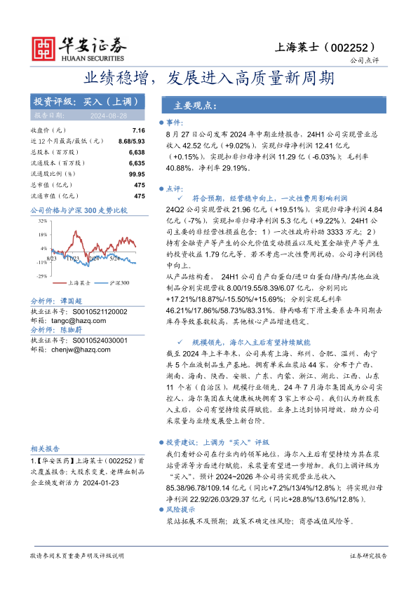 上海莱士2024年中期业绩表现稳健,核心业务持续增长,尽管受到一次性费用影响,但整体经营态势良好。