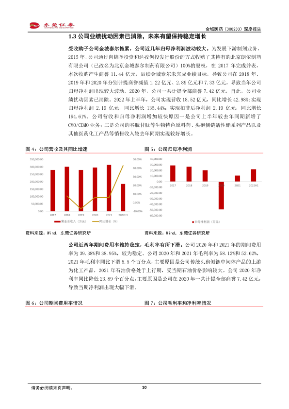 金城医药在2015年通过发行股份收购北京朗依制药有限公司(后更名为北京金城泰尔制药有限公司)100%股权,并于2017年完成并表,产生了11.44亿元的商誉。由于金城泰尔未能完成业绩目标,公司在2018年、2019年和2020年分别计提商誉减值1.22亿元、2.89亿元和7.33亿元,导致同期归母净利润出现较大波动。2020年,公司共计提全部商誉7.42亿元,自此,历史业绩扰动因素已基本消除。