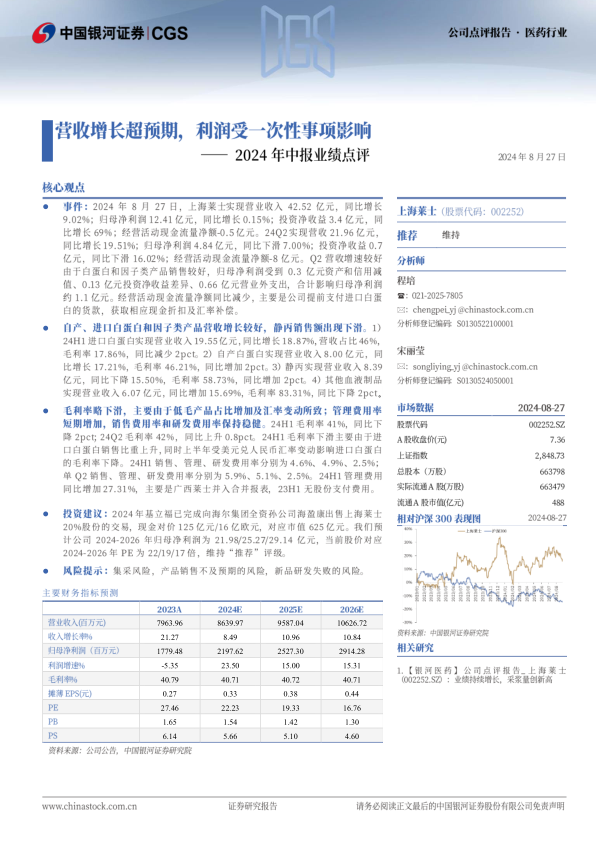 事件:2024年8月27日,上海莱士实现营业收入42.52亿元,同比增长9.02%;归母净利润12.41亿元,同比增长0.15%;投资净收益3.4亿元,同比增长69%;经营活动现金流量净额-0.5亿元。24Q2实现营收21.96亿元,同比增长19.51%;归母净利润4.84亿元,同比下滑7.00%;投资净收益0.7亿元,同比下滑16.02%;经营活动现金流量净额-8亿元。Q2营收增速较好由于白蛋白和因子类产品销售较好,归母净利润受到0.3亿元资产和信用减值、0.13亿元投资净收益差异、0.66亿元营业外支出,合计影响归母净利润约1.1亿元。经营活动现金流量净额同比减少,主要是公司提前支付进口白蛋白的货款,获取相应现金折扣及汇率补偿。