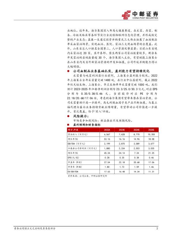 采浆量与吨浆利润居行业前列,上海莱士盈利能力较优。 2022年上海莱士全年采浆量突破 1400 吨,在行业中位居前列, 截止 2022年仅天坛生物、 上海莱士、 华兰生物单年采浆量突破 1000 吨。 我们预计 2023-2025 年归母净利润分别为 23.3/25.0/30.3 亿元,对应 EPS分 别 为 0.35/0.38/0.46 元 , 当 前 股 价 对 应 PE 分 别 为22.18/20.68/17.06 倍,考虑到海尔集团有望带来潜在浆站资源, 公司采浆量预计进一步提升, 高毛利凝血因子类产品不断拓展,与基立福代理白蛋白业务持续贡献业绩增量,有望带动公司价值进一步提升,首次覆盖,给予“买入”评级。