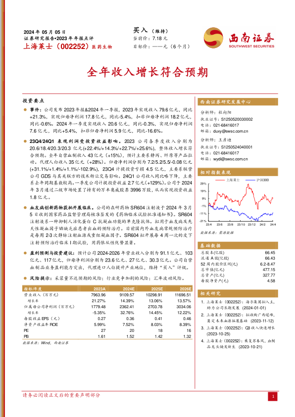 本报告对上海莱士(002252)的2023年年报和2024年一季报进行了分析,指出公司全年收入增长符合预期,但利润受到投资收益的影响。公司在研的血友病创新药物SR604注射液获批开展临床试验,有望提升用药依从性。基于公司自营血制品业务的盈利能力和代理进口人血白蛋白提升的产业地位,维持“买入”评级。报告还对公司未来几年的收入和利润进行了预测,并提出了采浆量不达预期、行业竞争加剧和汇率波动等风险提示。