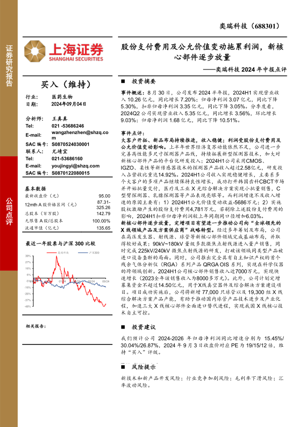 奕瑞科技2024年中报显示,公司收入稳健增长,但利润受到非经营性因素的影响。公司在新核心部件领域的布局和定增项目的推进,有望推动其战略转型,并在X线核心部件领域实现进口替代。维持“买入”评级,但需关注新技术开发、行业竞争、毛利率和汇率波动等风险。