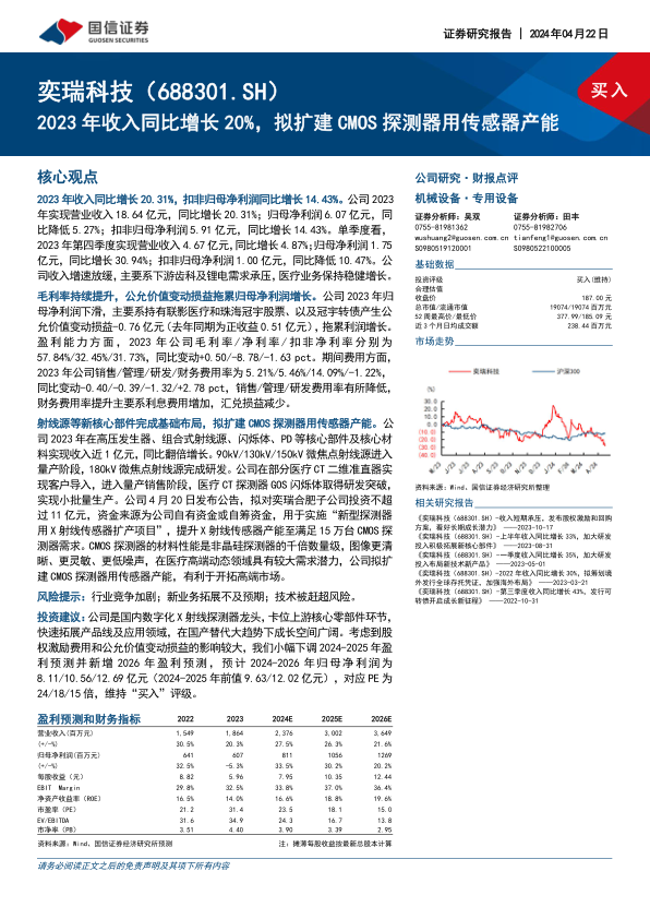 公司积极推进核心部件的国产化和产品线拓展,2023年高压发生器、组合式射线源、闪烁体、PD等核心部件及核心材料收入接近1亿元,实现翻倍增长。多款微焦点射线源进入量产或完成研发,医疗CT二维准直器实现客户导入,医疗CT探测器GOS闪烁体取得研发突破。为抓住高端市场机遇,公司计划投资不超过11亿元扩建新型探测器用X射线传感器产能,以满足15万台CMOS探测器需求,旨在提升在医疗高端动态领域的竞争力。国信证券维持“买入”评级,并基于股权激励费用和公允价值变动损益的影响,小幅下调了2024-2025年盈利预测,同时新增2026年预测,预计未来三年归母净利润将持续增长。