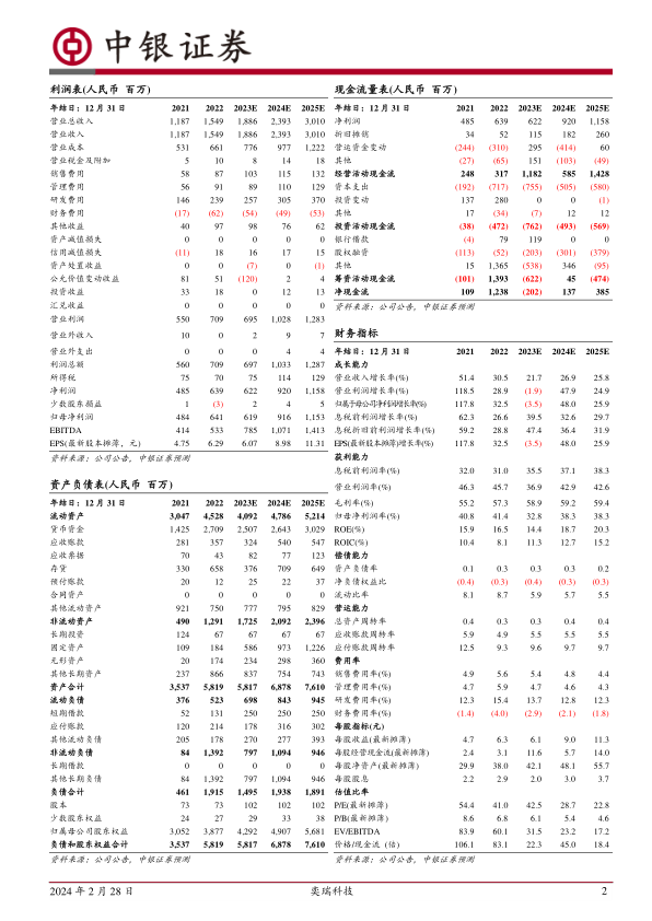 根据公司业绩情况调整盈利预期,公司2023年四季度业绩增长有所放缓:预期公司2023年、2024年、2025年归母净利润分别为6.19亿元、9.16亿元、11.53亿元,EPS分别为6.07元、8.98元和11.31元。根据2024年2月27日收盘价,预期公司2023年、2024年和2025年市盈率为42.5倍、28.7倍和22.8倍。维持买入评级。(2024年1月,预期公司2023年、2024年和2025年归母净利润分别为6.52亿元、9.55亿元和12.28亿元,EPS分别为6.39元、9.36元和12.04元。)