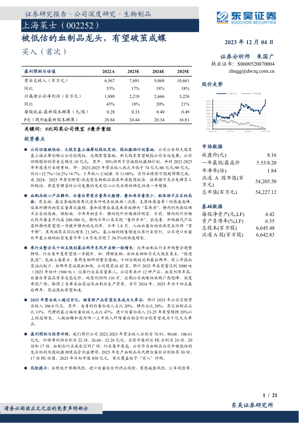 上海莱士作为被低估的血制品龙头,正迎来破茧成蝶的关键时期。股权激励计划的落地、大股东股权变动的预期以及持续增长的采浆量和丰富的产品线,共同构筑了公司未来业绩高增长的坚实基础。面对静丙和白蛋白等核心产品供不应求的市场局面,公司凭借其在浆源拓展、产品创新和高血浆利用率方面的优势,有望持续提升市场份额和盈利能力。预计2025年营业收入将超过百亿,独家新产品有望成为大单品。基于对公司2023-2025年营收和归母净利润的预测,并考虑血制品行业的广阔成长空间和公司龙头地位,给予“买入”评级,目标市值850亿元。投资者需关注业绩低于预期、进口白蛋白合作终止、商誉减值及汇率波动等风险。